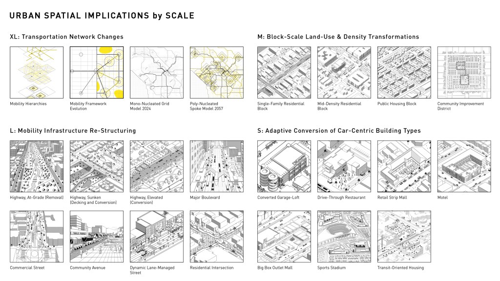 Perhaps. If you’ve purchased a car in the last few decades, it likely includes some autonomous features. Meanwhile, companies like Waymo, Zoox, and Cruise have been testing and deploying driverless ride-hailing services across various U.S. cities. Technocrats, investors, and media outlets present a vision of AVs as the next transformative technology—poised to revolutionize not just transportation but also the way we organize our daily lives. However, their vision largely assumes a future anchored in private car ownership and market-driven solutions, overlooking both the state’s potential role and the possibility of integrating AVs into public transit systems. More critically, designers and urban planners appear largely absent from these discussions, leaving the implications of AVs on the built environment—our streets, neighborhoods, and cityscapes—insufficiently explored. It is precisely these overlooked dimensions that Autonomous Urbanism seeks to illuminate.
