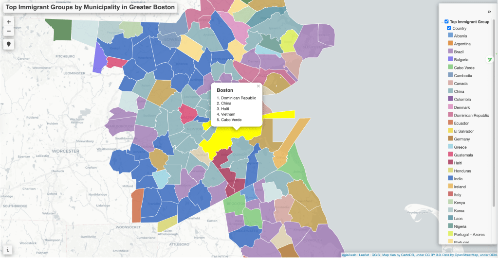 An interactive map visualizing the top five immigrant origin countries in each municipality in Greater Boston, using data from the 2023 American Community Survey.