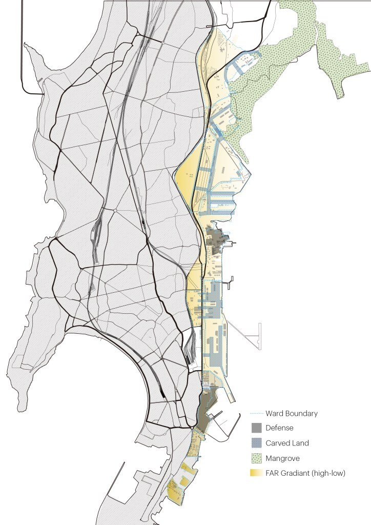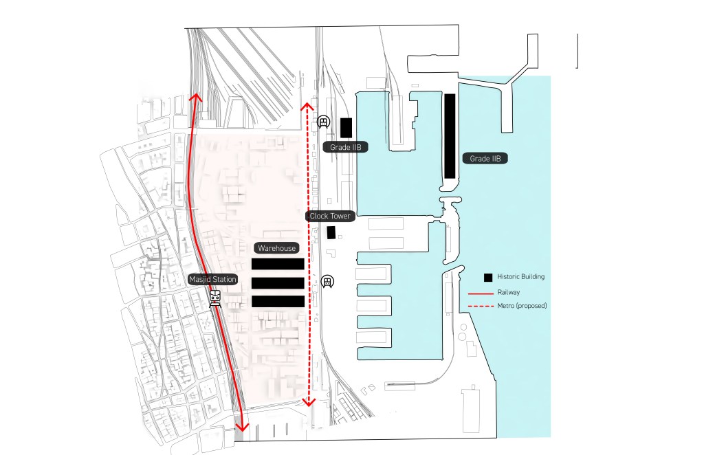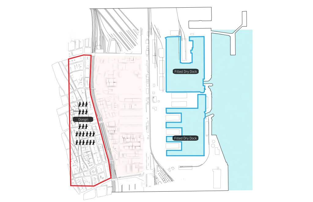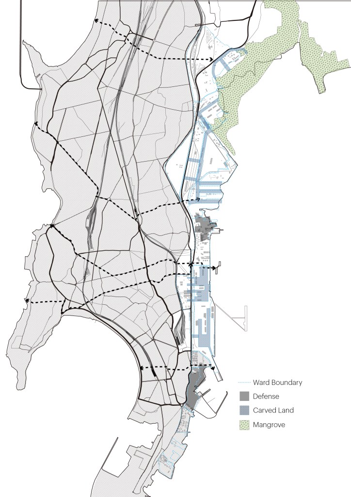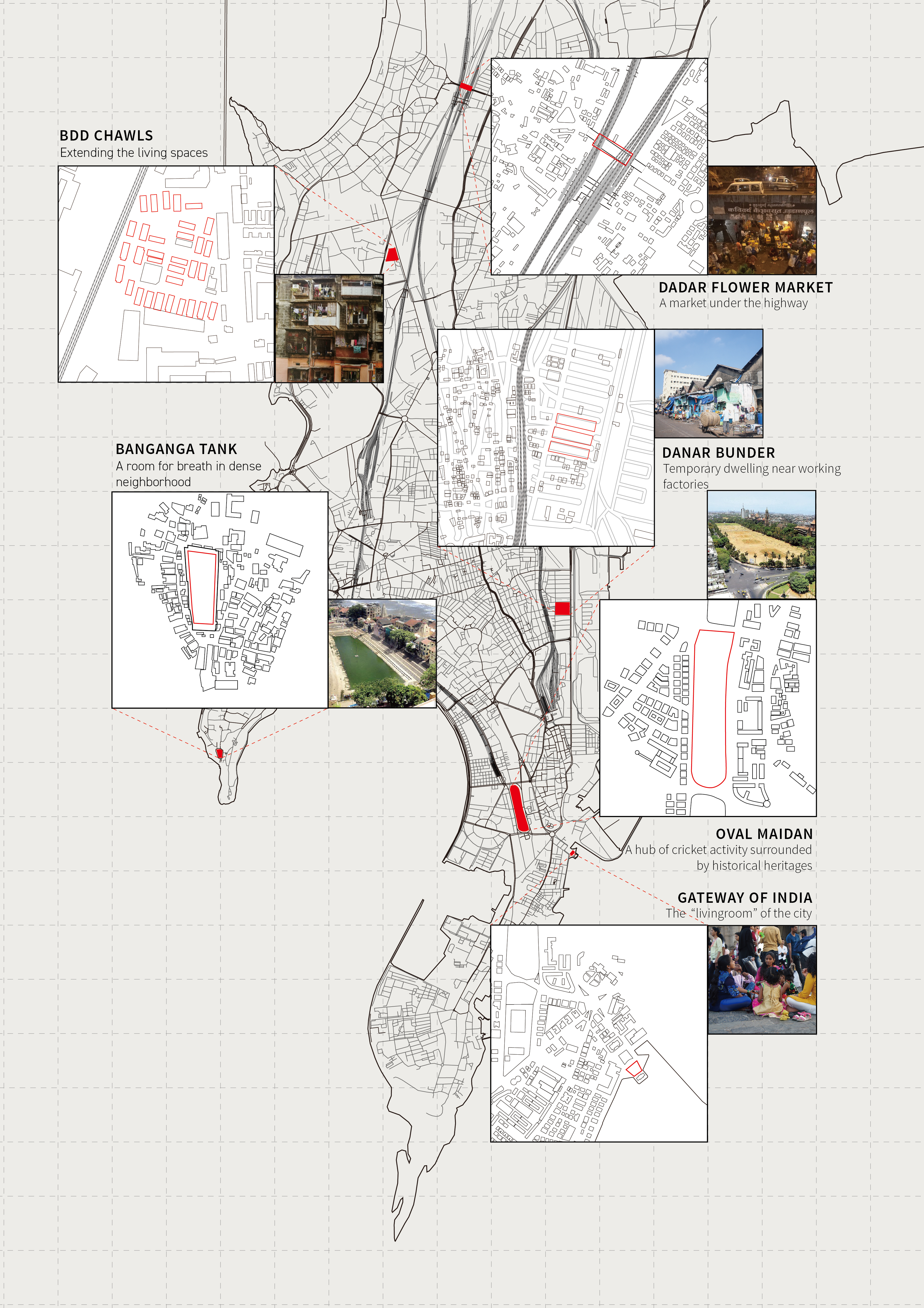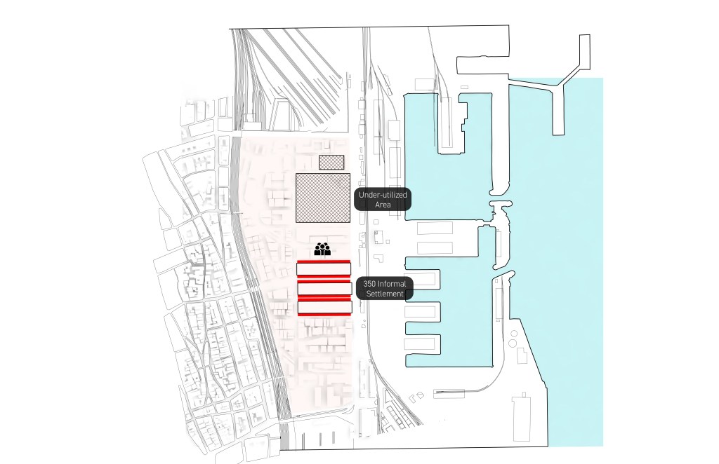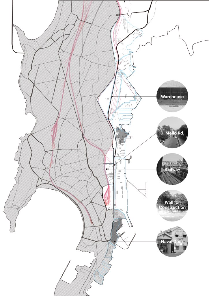 Barriers from the railway and fast traffic.The site is adjacent to Dongri – a highly populated neighborhood and two docks that have been filled and carved out repeatedly.The site has 350 informal settlements and under- utilized areas as vacant parking lots.The site has important assets such as historical buildings and a transit network.