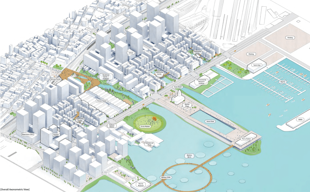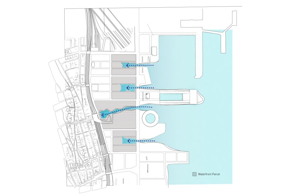 Create access corridors linking the inland to the waterfront through critical neighborhoods and transit nodes.Bring water to the inland to increase waterfront development areas and provide more public open space.Control a gradient of FAR that decreases towards the water to ensure a view out and prevent building “walls” along the waterfront.