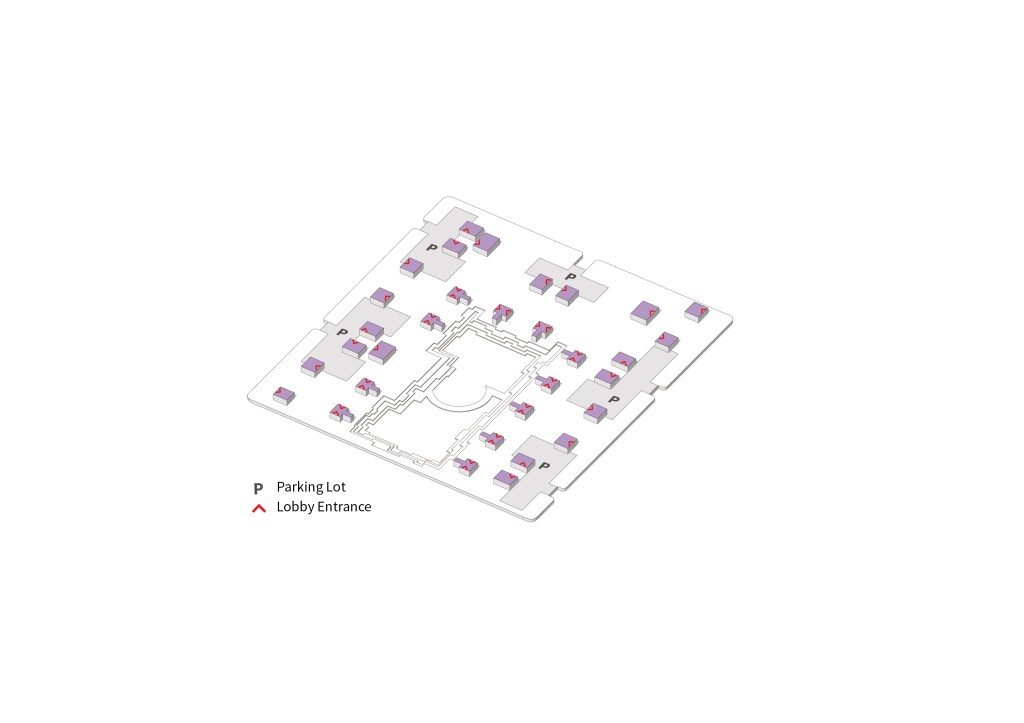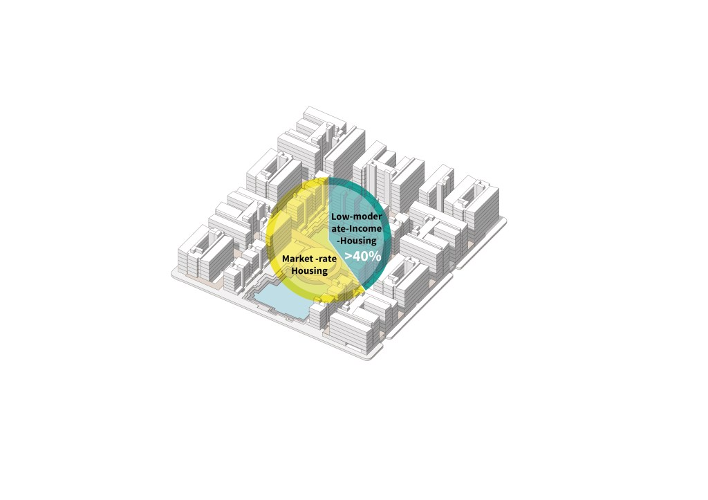 Water TankRetail edges for small and/or women-owned businessFlexible community rooms for meetings and gatheringsLobby at the ground floorThe elevated podium frees up the ground floor and provides circulation on the first-levelMarket-rate housing along the inner courtyard for better viewsLow-to-moderate income housing along the peripheral with regulated densityMinimum 40% GSF of low-to- moderate housing in each block. Relocated residents on-site to be housed first