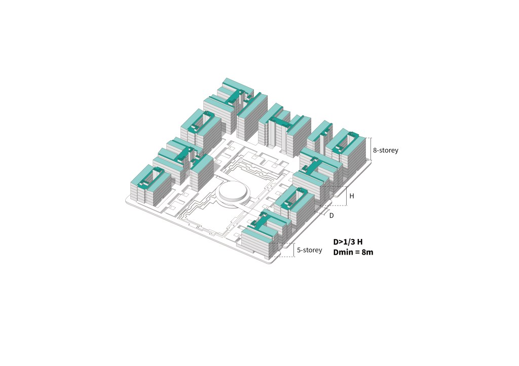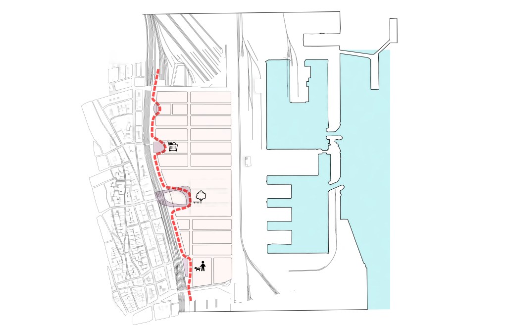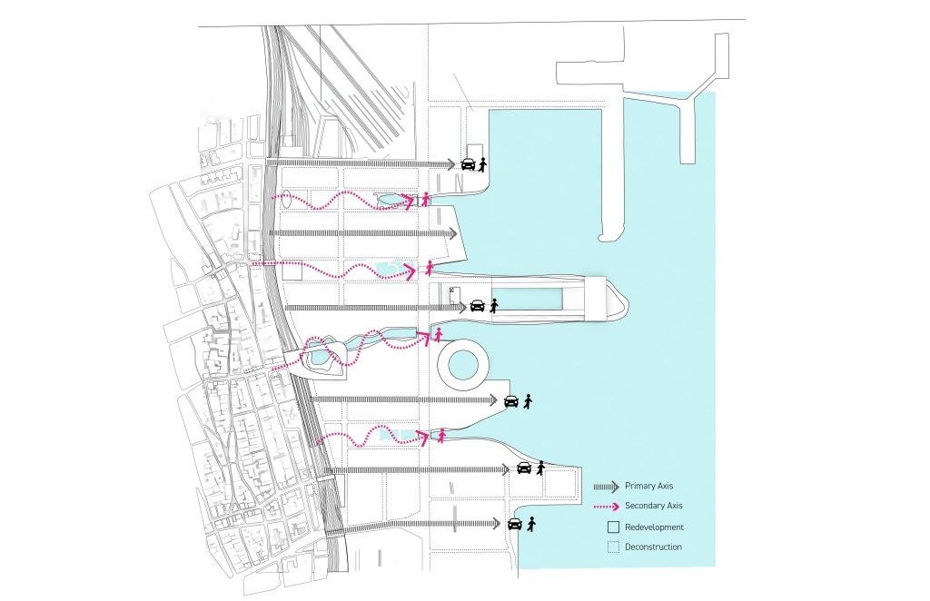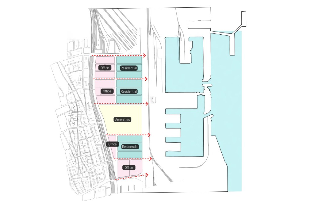 Divide the site into three different functional areas by super-block.Introduce a promenade along the railway with commercials and open-space components. Buildings need to retreat from the railway edge.Bring water into the middle of each superblock to activate the edge and increase the property value.Primary access utilizes the ROW while pedestrians can choose the mid-block “paseo”. Vehicular and non-vehicular traffic are separated.