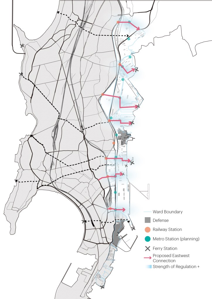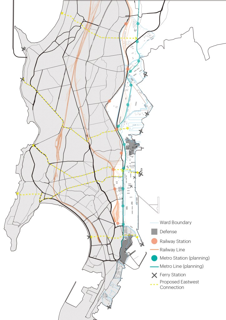 The waterfront is separated from the city grid by railway, fast traffic and industrial areas.Scattered informal settlements with bad sanitary conditions; however, they are providing services important for the overall economy.The waterfront has a dense transit network from the railway to the metro to the ferry. There is an intention to increase connectivity between the west and east waterfront as well.