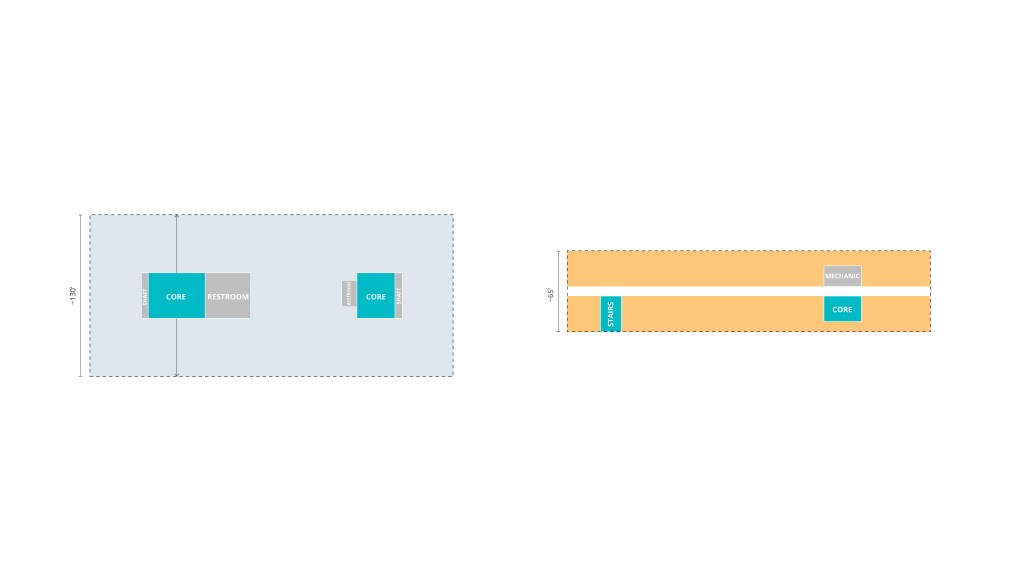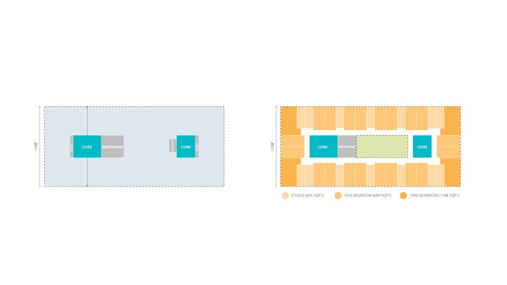With the proposed narrower, deeper units, a generic open office can be transformed into a courtyard apartment.