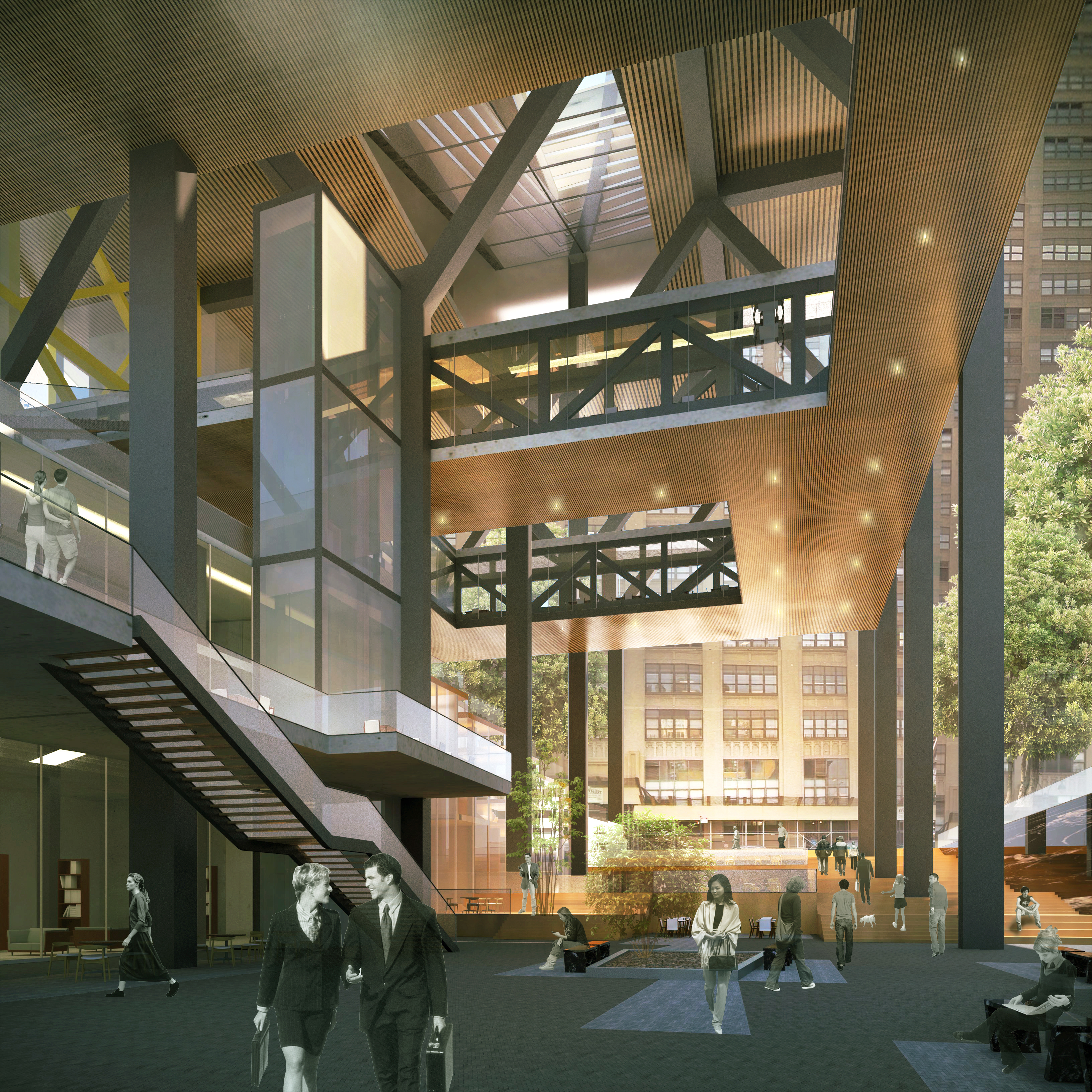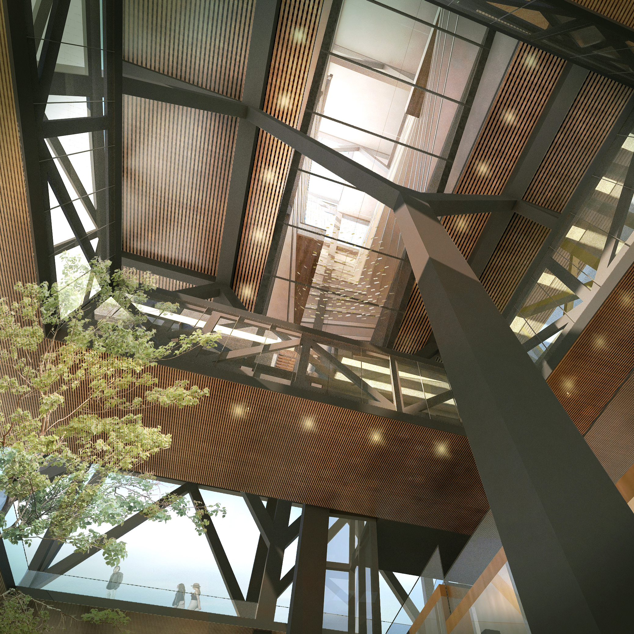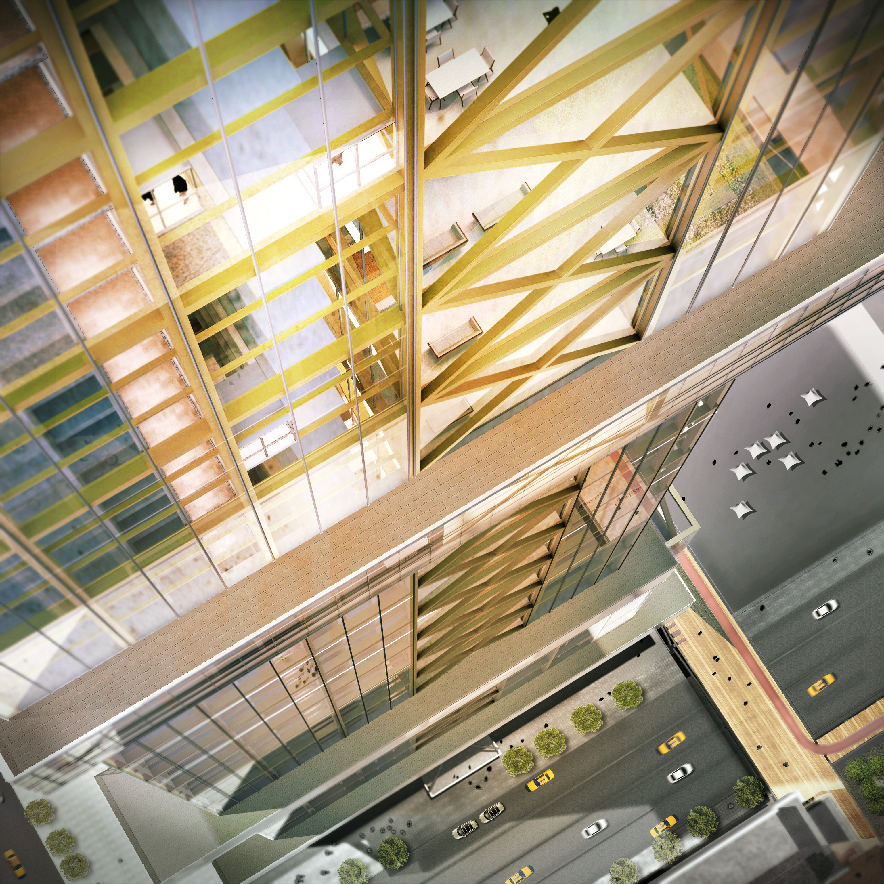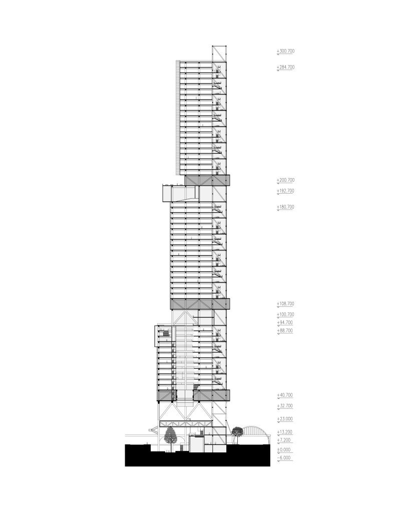 Individually, we design a skyscraper connected by the central spine that satisfies the private developer and contributes to the city’s public life. As an office tower, it is lifted above the ground to encourage free 24-hour pedestrian flow. The lower volume of the tower is revealed to the public through an atrium. If high density is the new urbanism, skyscrapers have to be integrated into street life, and the institutional image should be minimized.