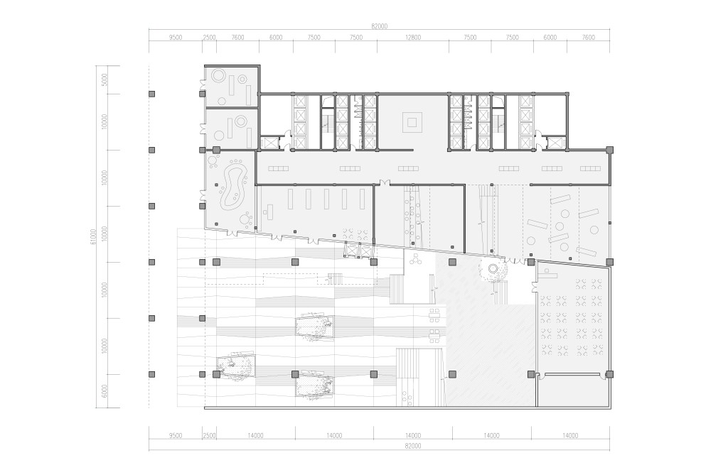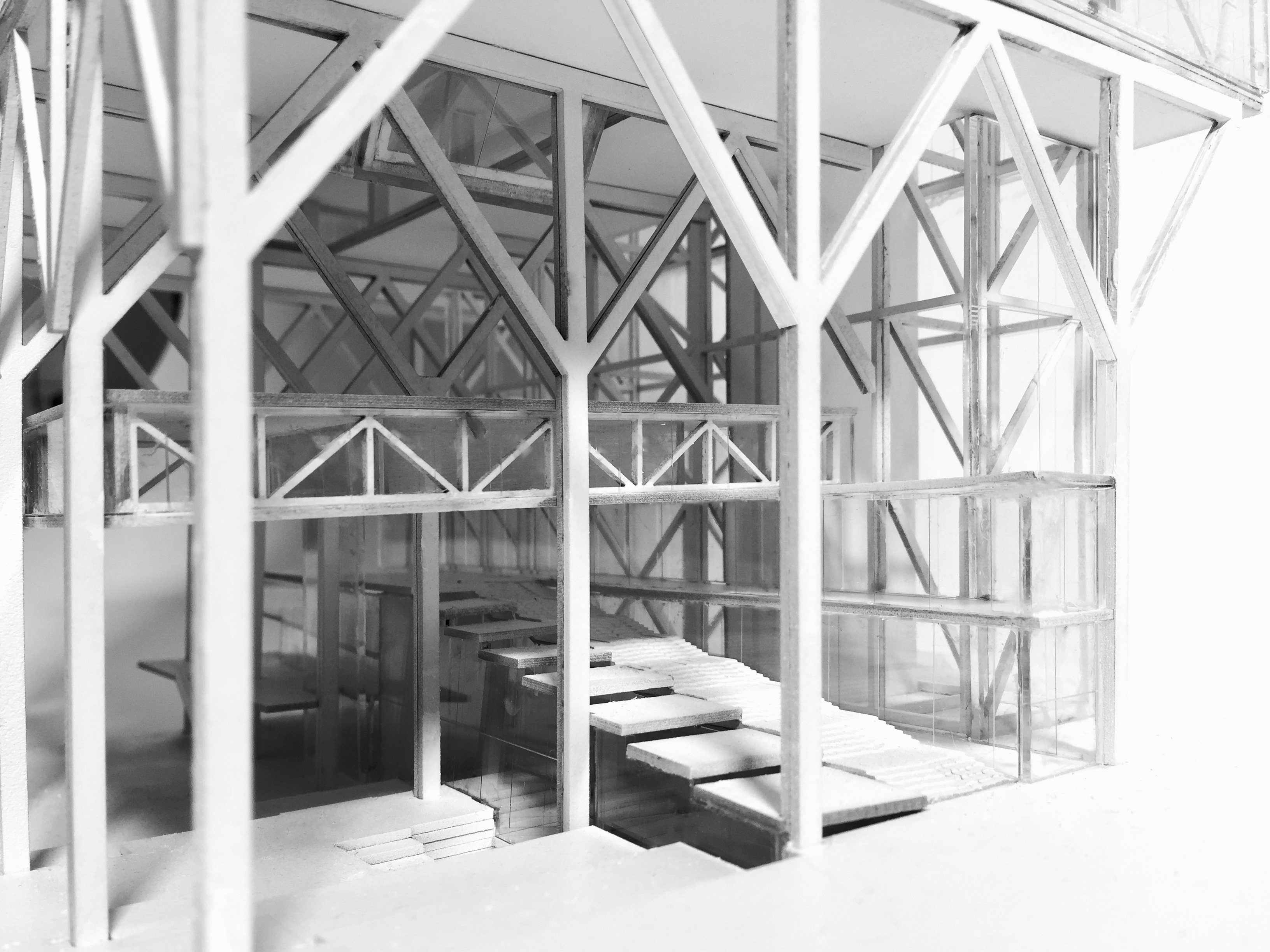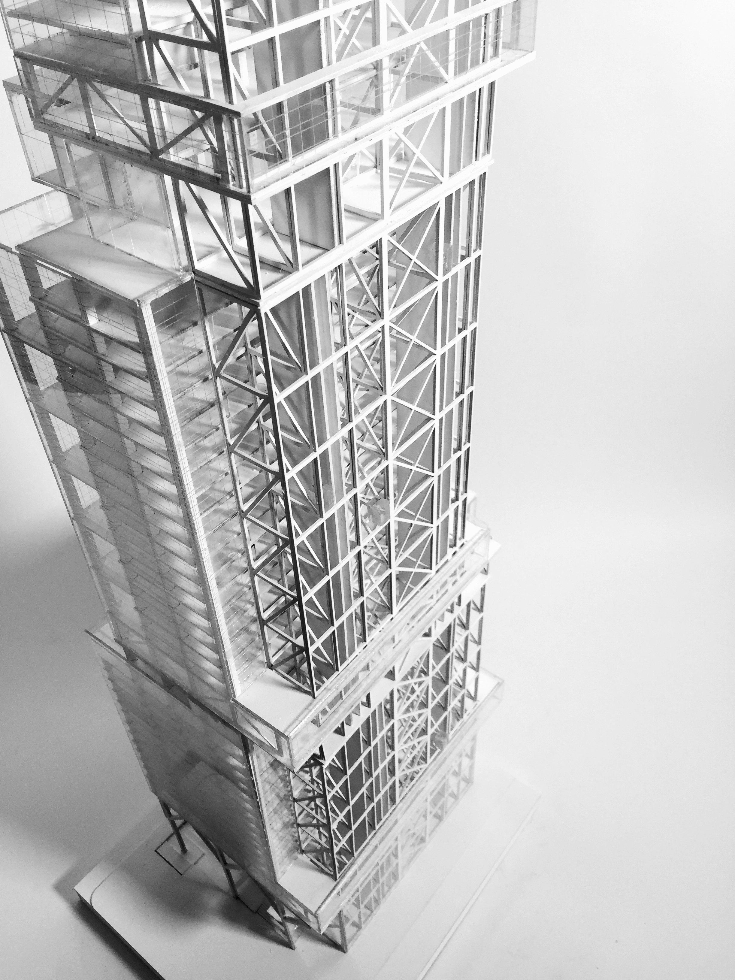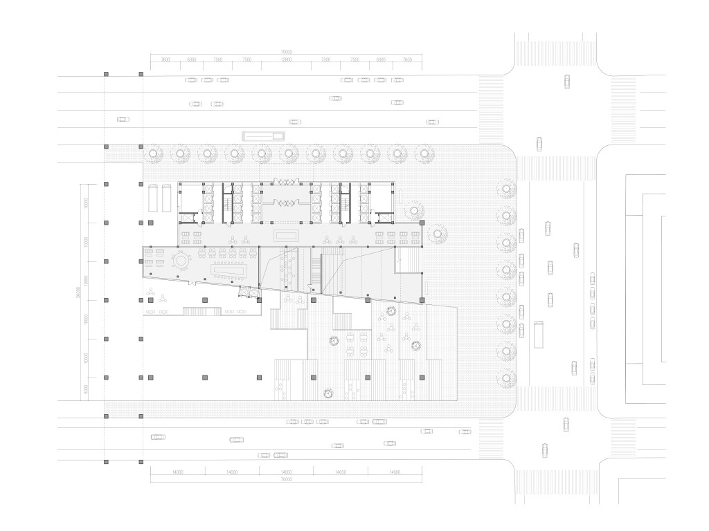 Individually, we design a skyscraper connected by the central spine that satisfies the private developer and contributes to the city’s public life. As an office tower, it is lifted above the ground to encourage free 24-hour pedestrian flow. The lower volume of the tower is revealed to the public through an atrium. If high density is the new urbanism, skyscrapers have to be integrated into street life, and the institutional image should be minimized.