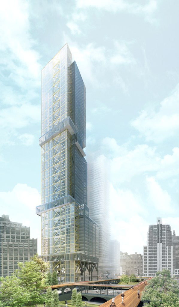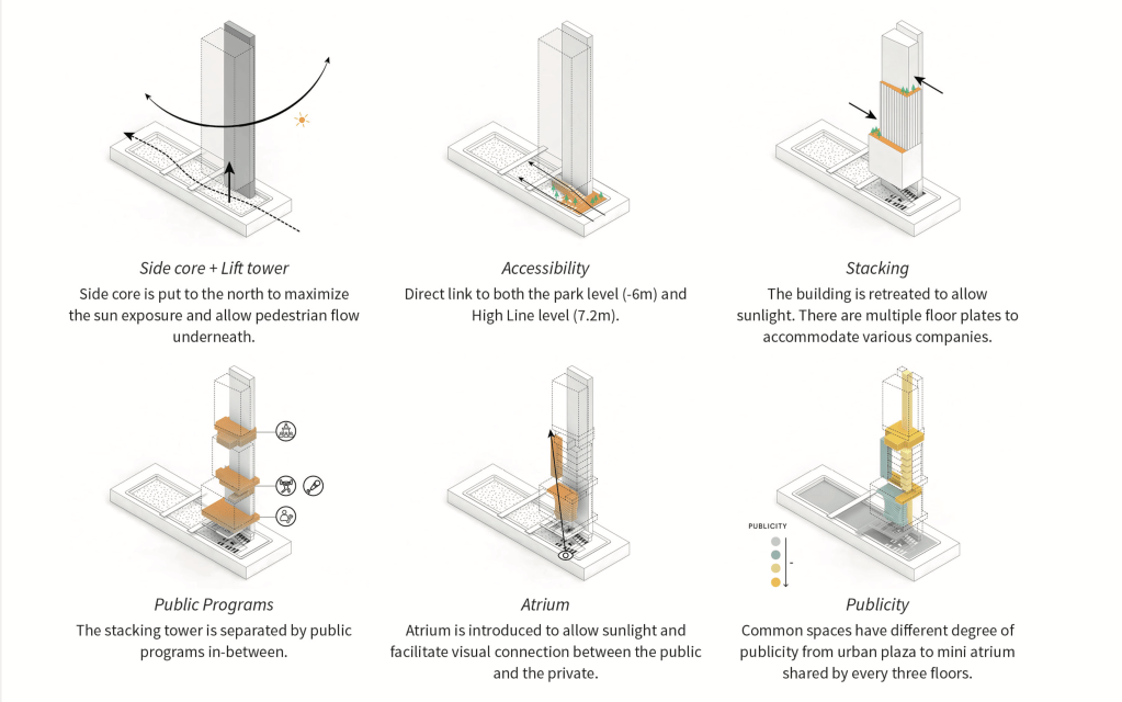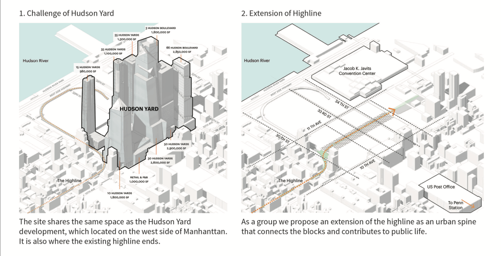 This is a collective effort to answer one question: whether a newly conceived spine can be a generator for a city primarily consisting of high-rise towers. The central spine, which divides the site into 10 blocks, is an extension of the existing High Line.